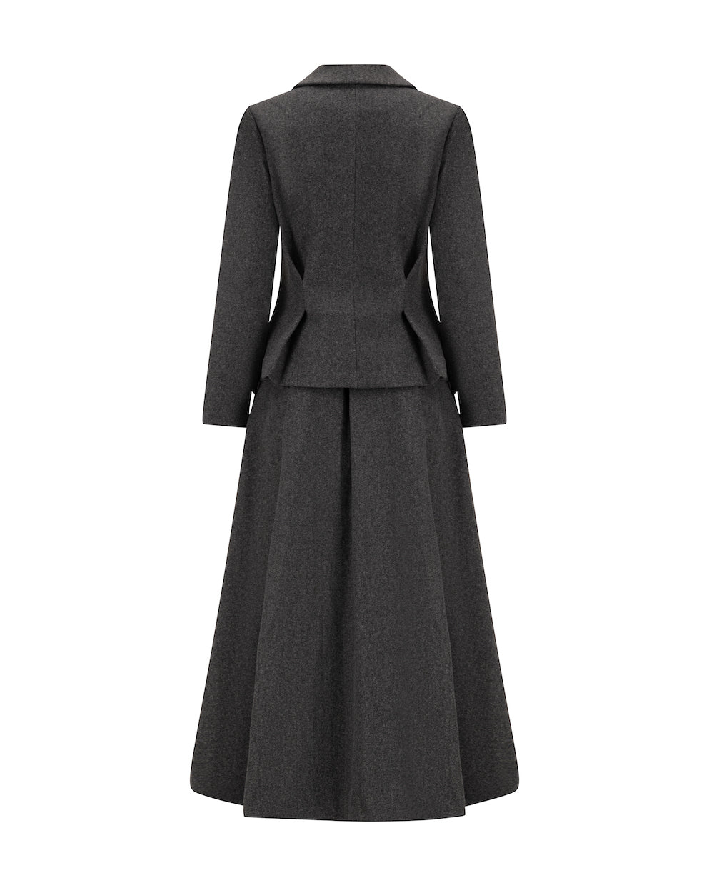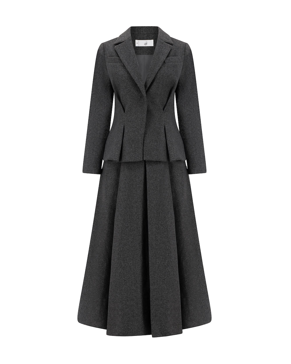 An elegant two-piece winter suit, featuring a skirt and blazer.