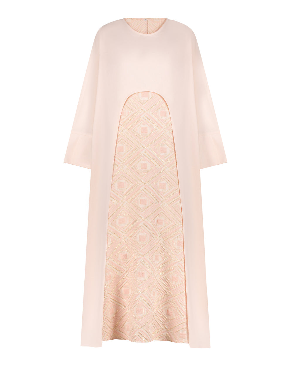 • تتكون من قطعتين: طبقة خارجية بلون هادئ وقصة مبتكرة، مع فتحة أمامية تبرز الطبقة الداخلية ذات النقوش الفخمة بتفاصيل هندسية أنيقة.