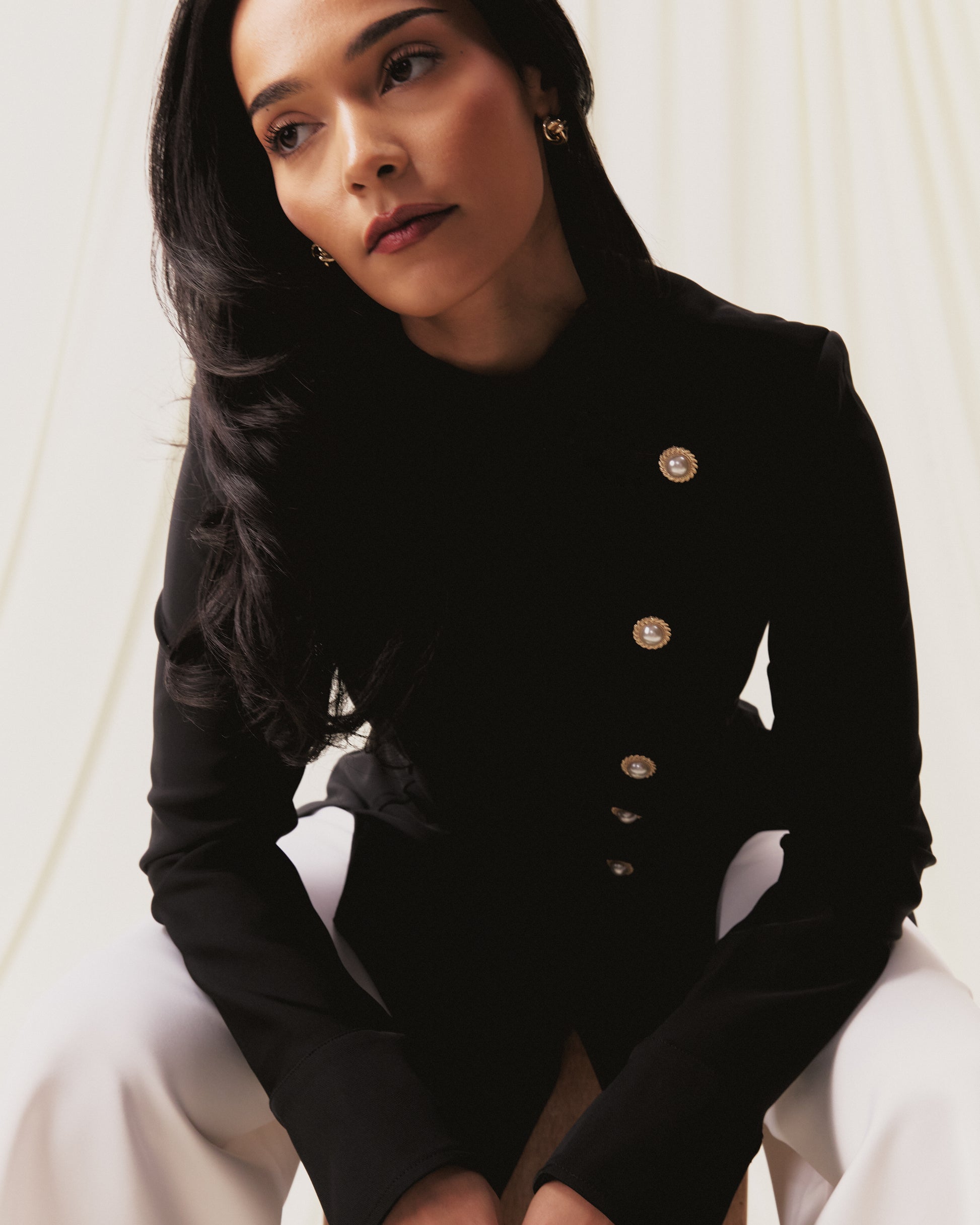 Luxury black blazer with glossy pearl-detailed buttons and a unique tailored cut that highlights the waist and enhances the silhouette. Perfect for elevated looks, important meetings, or any day when you want unmatched confidence and elegance.
