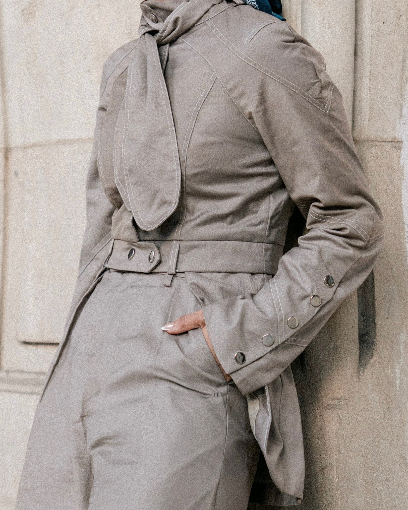 The blazer showcases a cinched waist, structured shoulders, and silver button details on the sleeves, blending classic elegance with subtle military influence.