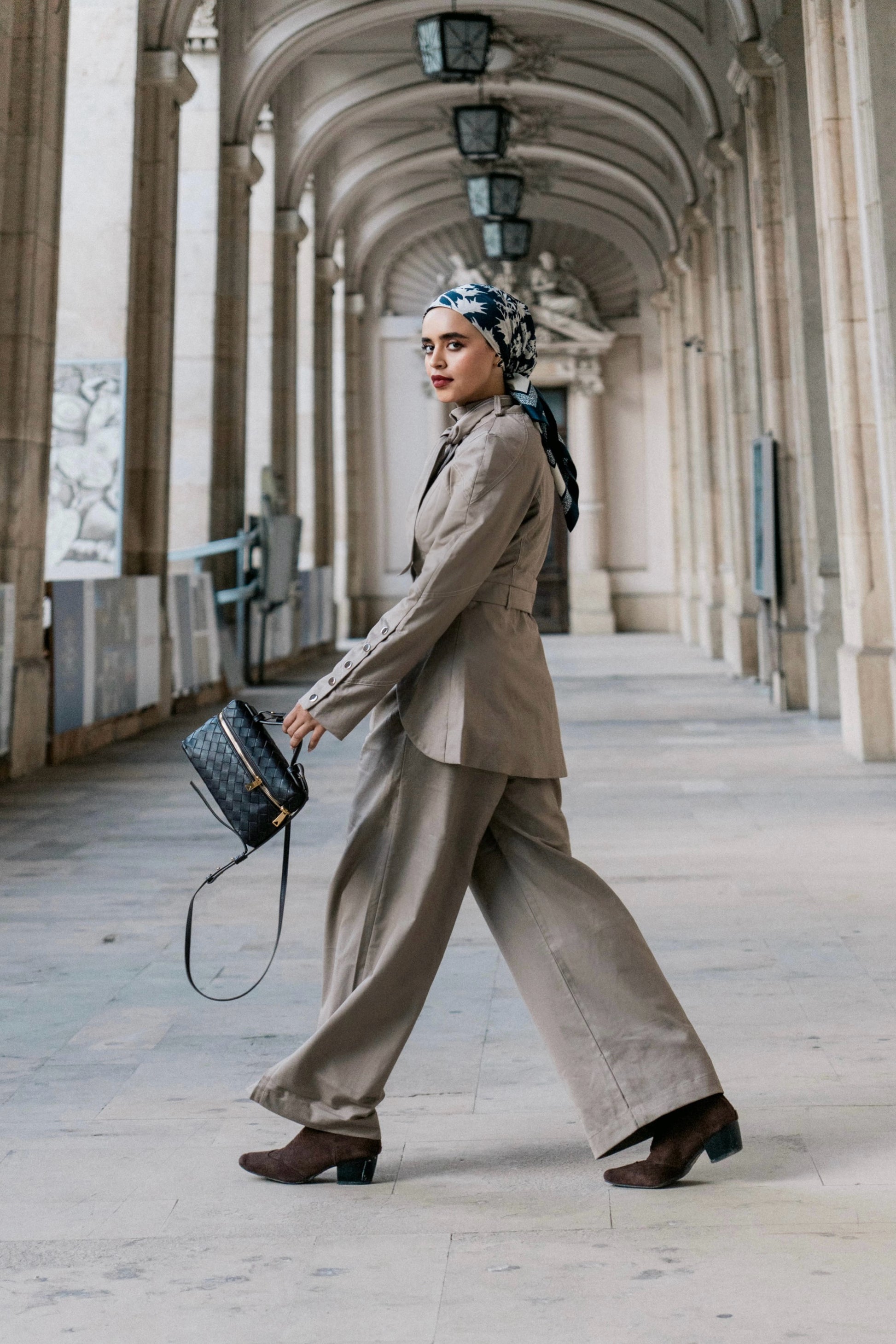 البنطلون واسع بقصّة عالية الخصر مع طيّات أمامية تعطي انسيابية وأناقة عملية في الوقت نفسه.