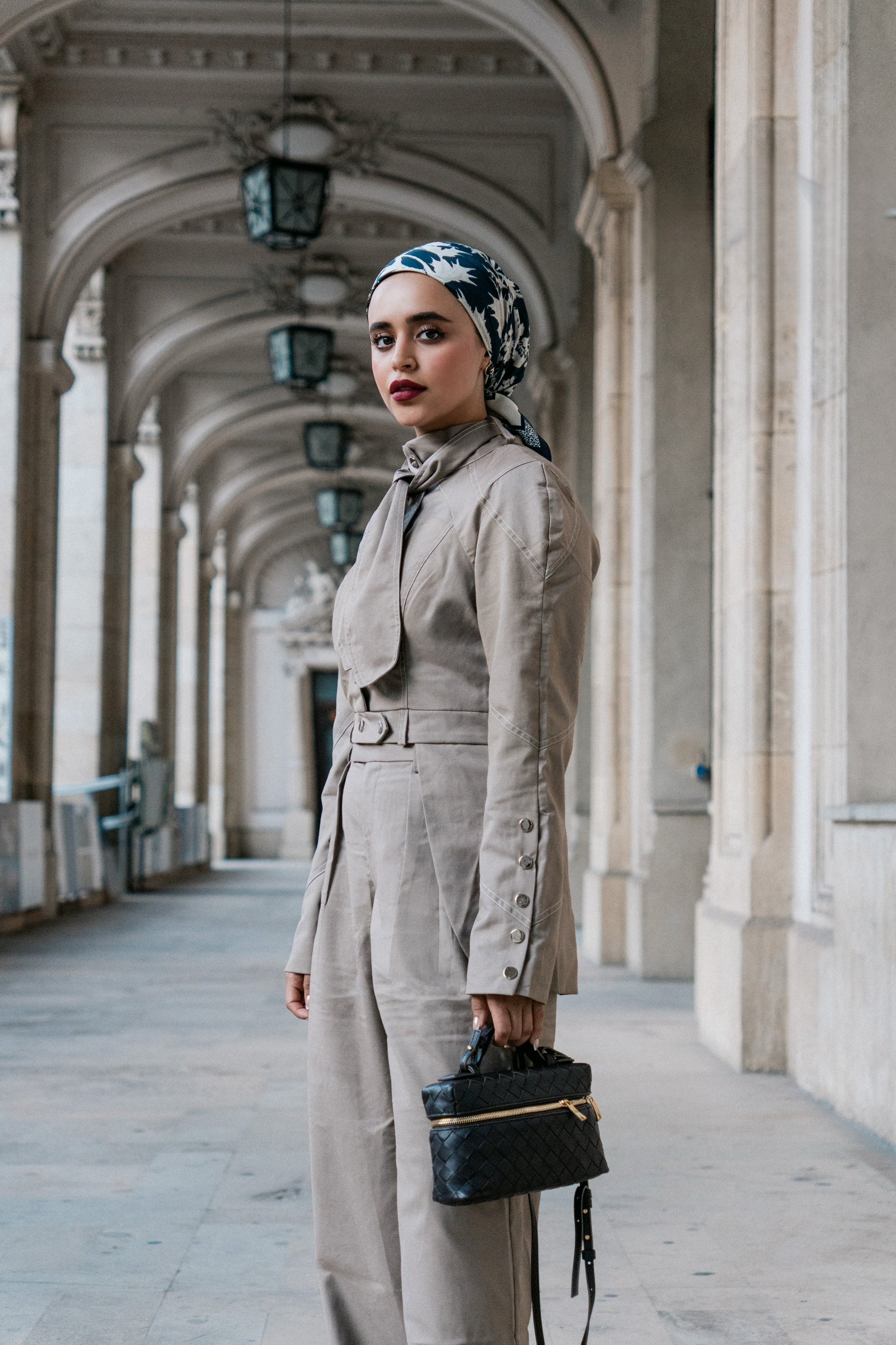 طقم مكوّن من بليزر وبنطلون بلون خاكي أنيق، بتفاصيل دقيقة تعكس فخامة التصميم وقوة الحضور.