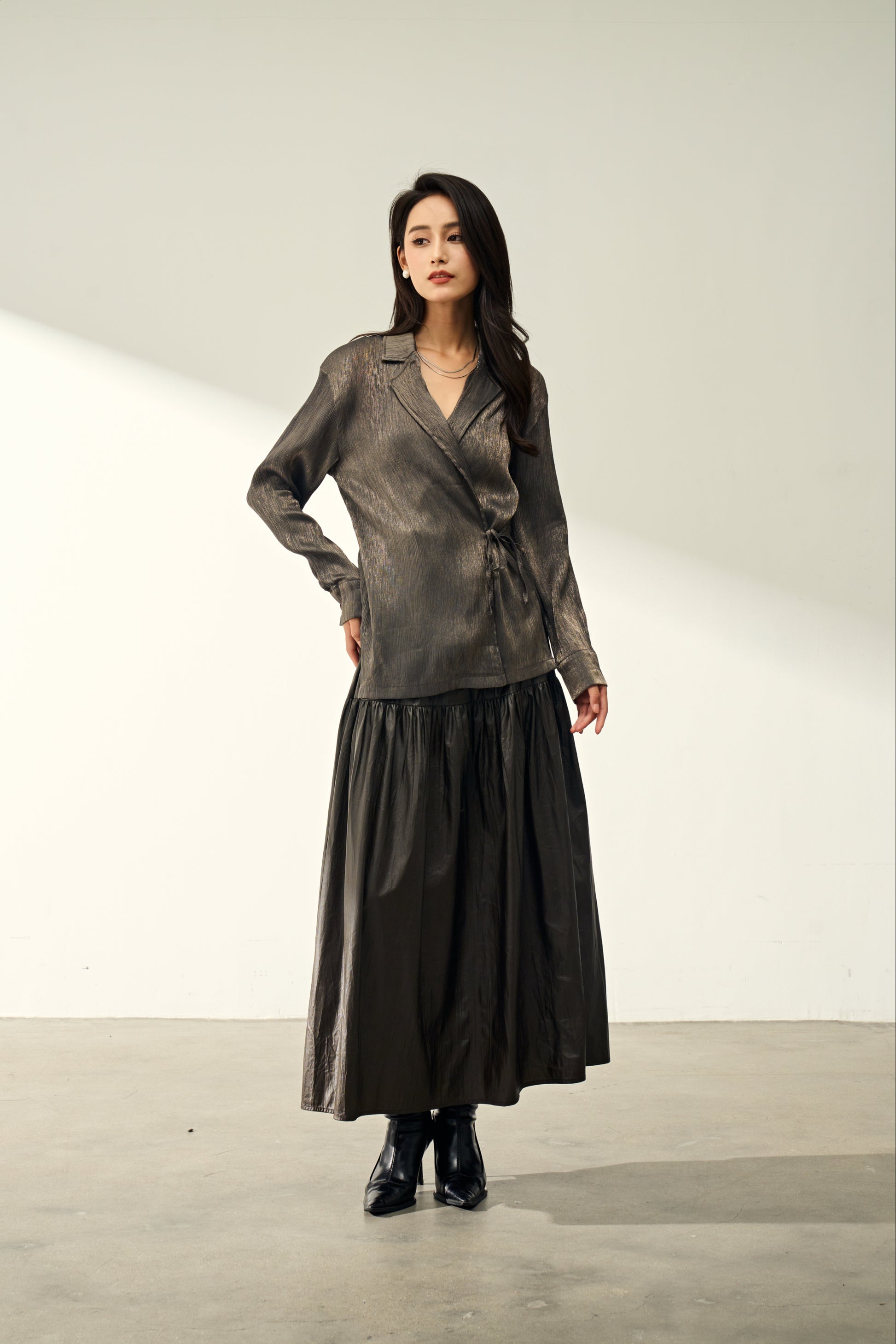 A two-piece set featuring an elegant wrap-style blouse with a side tie, made of a soft, lightweight, and subtly shiny summer fabric. It comes with a long skirt crafted from a crinkled, glossy material that adds a sophisticated touch. Please check the size chart before placing an order.