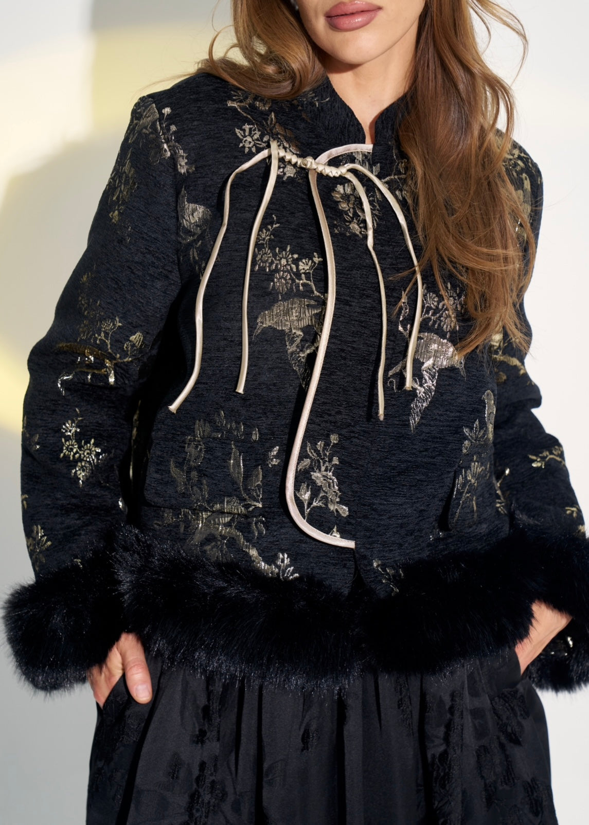 A refined look that beautifully blends luxury with classic elegance. The outfit features a short black jacket adorned with delicate gold embroidery, complemented by a front tie that adds a feminine, graceful touch. The jacket is accented with soft faux-fur trims on the sleeves and hem, giving it a warm and sophisticated winter feel. The long, flowing skirt cascades in a subtly glossy fabric with understated black floral patterns that add depth and movement.
