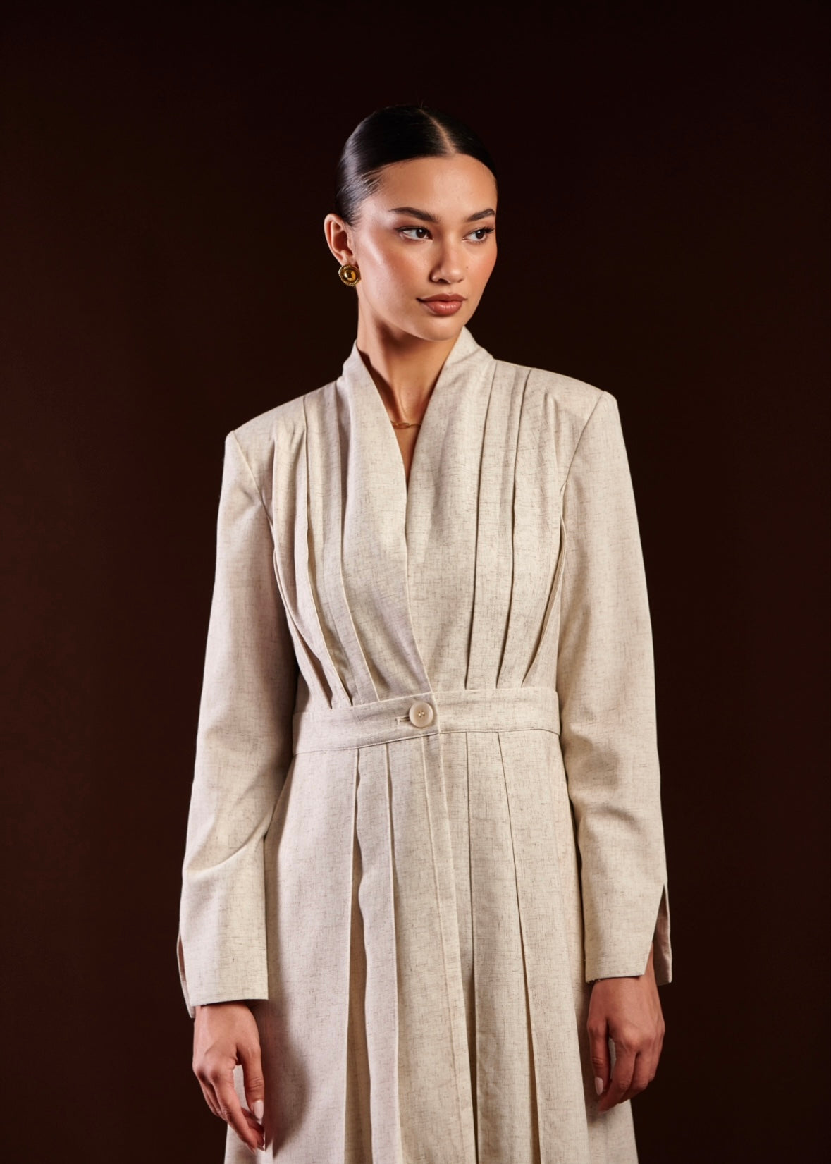 بليزر صيفي طويل بلون هادئ وخامة خفيفة وباردة، بقصة أنيقة وزر واحد عند الخصر مع فتحة أمامية واضحة. ينسق بسهولة مع بنطلون واسع أو فستان ضيق لتحصلي على طلة مرتبة وأنيقة. مناسب للإطلالات اليومية أو الرسمية بلمسة أنثوية راقية.